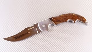 Клинок выполнен из российской стали 65х13, заявленная твердость по Роквелу 52-55 единиц. Это недорогая нержавеющая ножевая сталь среднего уровня, вполне достаточная для выполнения большинства задач. Клинок отполирован до зеркального блеска, его размеры: длина 14 см, толщина обуха в самой широкой части внушительные для складня 3,8 мм, но при своих габаритах клинок не выглядит толстым. Форма клинка - боуи, линия обуха заниженная, лезвие заужено к острию. Клинок в рукояти сидит плотно, горизонтальных и вертикальных люфтов нет.